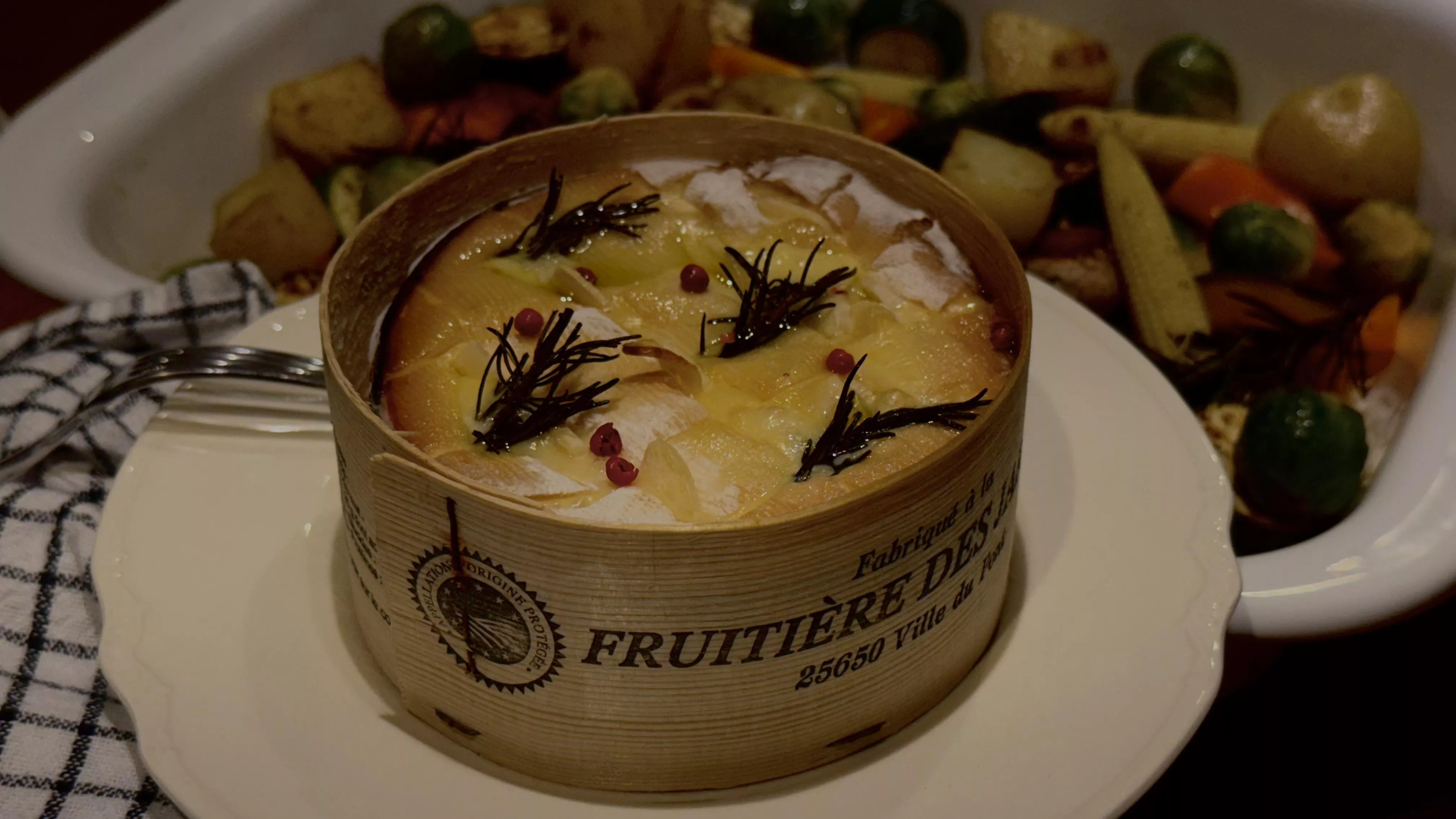 ① 將金山乳酪表面用刀畫幾個十字,把整顆或切片的大蒜、迷迭香塞進十字裡(請參考圖片)。